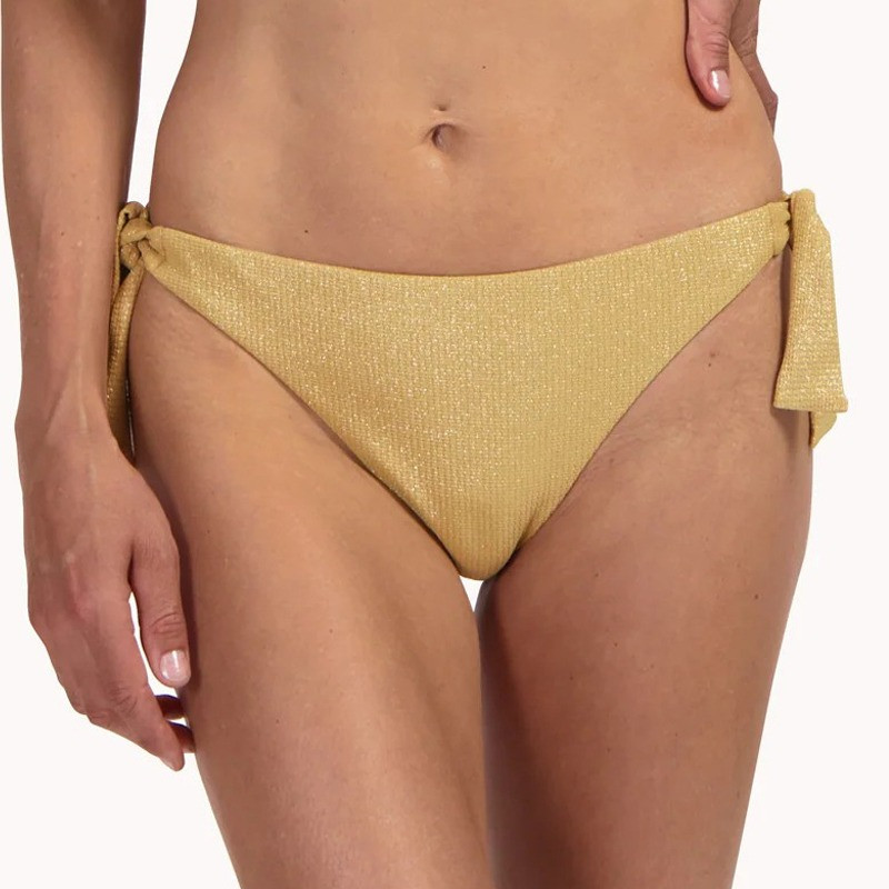 Das Golden Hour Triangle Bikini Oberteil von Cyell ist in der Farbe Golden Hour erhältlich. Das Bikini Oberteil ist mit dezenten goldenen Glitzerpartikeln verziert und sorgt für einen funkelnden, luxuriösen Look. Die Cups sind mit (herausnehmbaren) Polstern versehen, die den Brüsten eine schöne runde Form verleihen. Das Bikini-Oberteil wird im Nacken und am Rücken gebunden und lässt sich somit nach Wunsch anpassen. Der goldene Ring in den Trägern rundet dieses Bikini-Oberteil perfekt ab. Kombinieren Sie dieses Bikini-Oberteil mit einem der passenden Bikini-Höschen.
