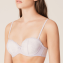 Der Pearl Trägerloser-BH von Marie Jo in der Farbe Orchid Petal. Die Körbchen dieses hell lila BH ist mit französische Leavers-Spitze überzogen. An den Seiten der Träger verläuft eine Perlenstickerei. Das Schleifchen und die Perlen zwischen den Körbchen runden das elegante Erscheinungsbild ab. Unterhalb der Körbchen ist ein silikonrand angebracht, so dass der Bh nicht herunterrutscht.