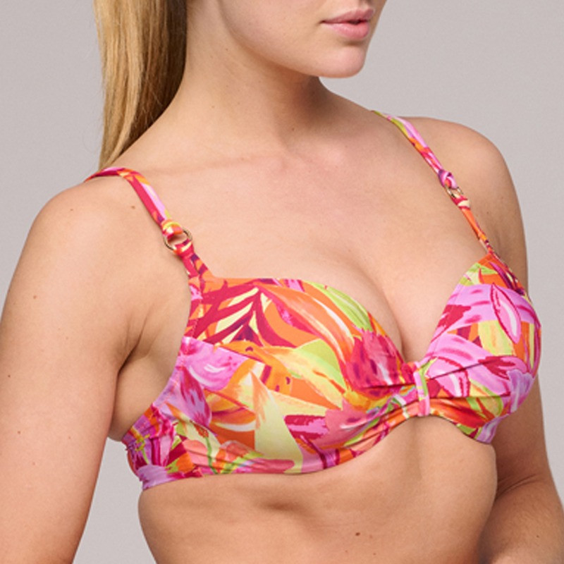 Das Shurbra Bügel Bikini Oberteil von Marie Jo Swim ist in der Farbe Musa gehalten, einem fruchtigen und sommerlichen Print. Dieses Bikinioberteil ist perfekt für Fans von kräftigen Prints und leuchtenden Farben. Die bequemen Vollcups bieten optimalen Halt und bedecken elegant den Busen. Der verspielte Tropenprint mit einer Explosion aus Pink, Grün, Orange und Gelb verströmt Sommer pur. Das Bikinioberteil kann auf verschiedene Arten getragen werden, unter anderem als Neckholder, für einen vielseitigen und stilvollen Look. Kombinieren Sie dieses Bikinioberteil mit einem der passenden Shurbra Bikinislips für ein komplettes und sonniges Strandoutfit.