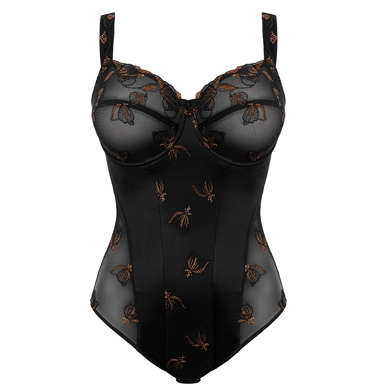 Der Ulla Full Cup BH von Ulla kommt in der Farbe Schwarz. Dieser schwarze BH hat feste, nicht vorgeformte Cups, die die Brüste gut stützen. Die Oberseite der Cups ist aus transparentem Tüll, der mit einer bronzefarbenen Blumenstickerei verziert ist, die sich über die Schulterträger fortsetzt. Die Körbchen umschließen die Brüste vollständig und heben sie nach vorne, um sie zu zentrieren und eine perfekt runde Form zu erhalten. Durch die hochgeschlossenen Cups ist der BH auch bei großen Körbchengrößen sehr angenehm zu tragen. Die Schleife zwischen den Cups rundet den BH ab. Kombinieren Sie diesen BH mit einem der passenden Slips.